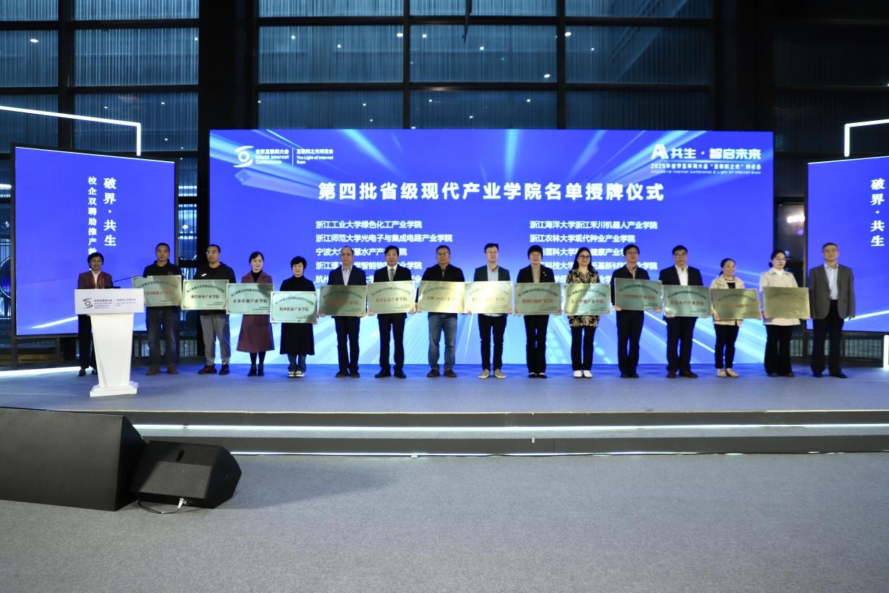 11月6日下午,2025年世界互联网大会“互联网之光”博览会在乌镇正式启幕。由浙江省经信厅、浙江省教育厅联合举办“2025年产教融合暨校企双聘推进会”在乌镇同步举行。会上,未来传播产业学院获第四批省重点支持建设现代产业学院授牌。未来传播学院党委书记、未来传播产业学院院长李蓉受邀参加此次会议,并代表文科产业学院作题为《智启未来:构建AI原生的传播教育新范式》主题发言。