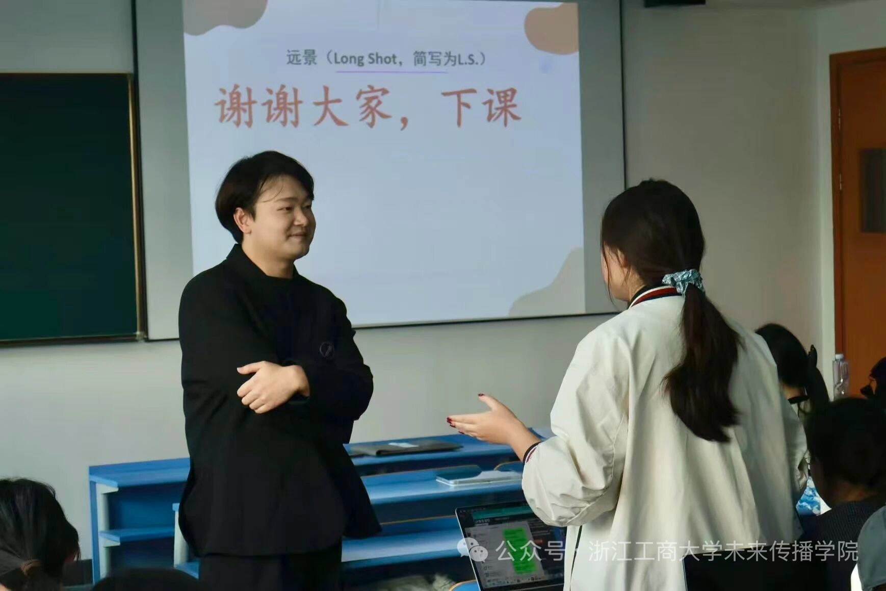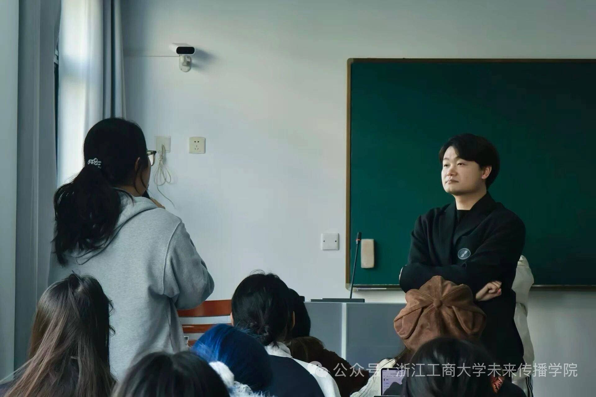 同学们就感兴趣的话题与陈嵩老师进一步交流。周馨怡同学率先提问:“中国媒体未来的发展之路是内容服务于技术还是技术服务于内容?”陈嵩老师回复称二者同样重要,中国有兼顾技术与内容的实力,二者应相互服务。陆宁同学就“素人综艺在中国媒体市场上越来越普遍的原因”提问,陈嵩老师表示,素人综艺兴起是好事,意味着媒体镜头从明星转向普通人,不过其中不乏众多履历优秀的“伪素人”,并非真正的普通人。