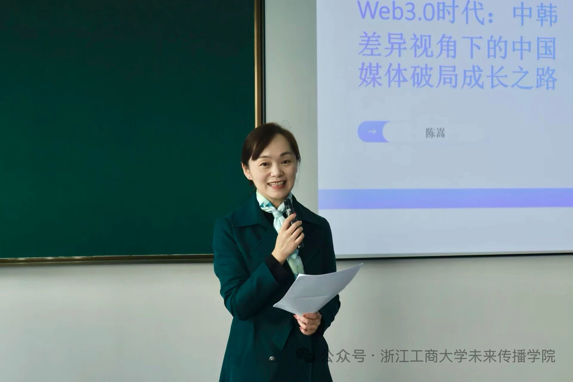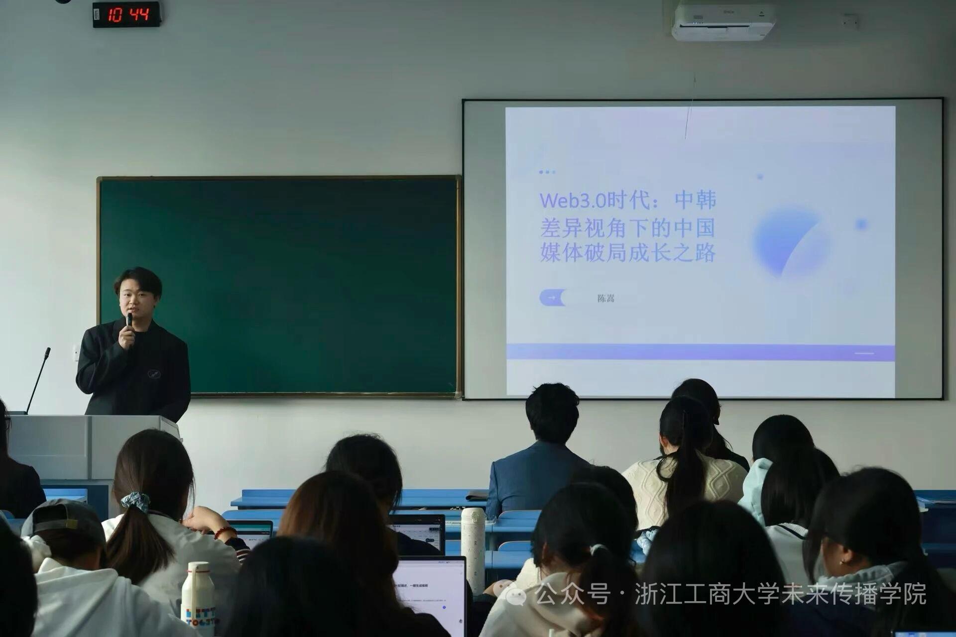 11月14日,韩国新闻媒体协会外籍干事、新媒体语言研究学者、新闻传播学博士,助教研究员陈嵩老师莅临我院,结合其学术研究成果与自身行业经历,以“Web3.0时代中韩差异视角下--中国媒体的破局成长之路”为主题,为2024级新闻专业的学生带来一场兼具实用性与启发性的精彩讲座。未来传播学院党委书记李蓉主持本次讲座。