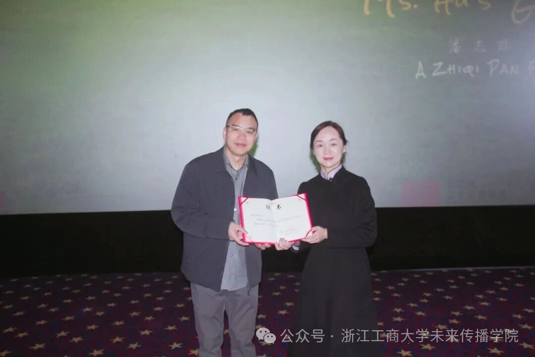 李蓉老师为潘志琪导演颁发了浙江工商大学实务导师的聘书。