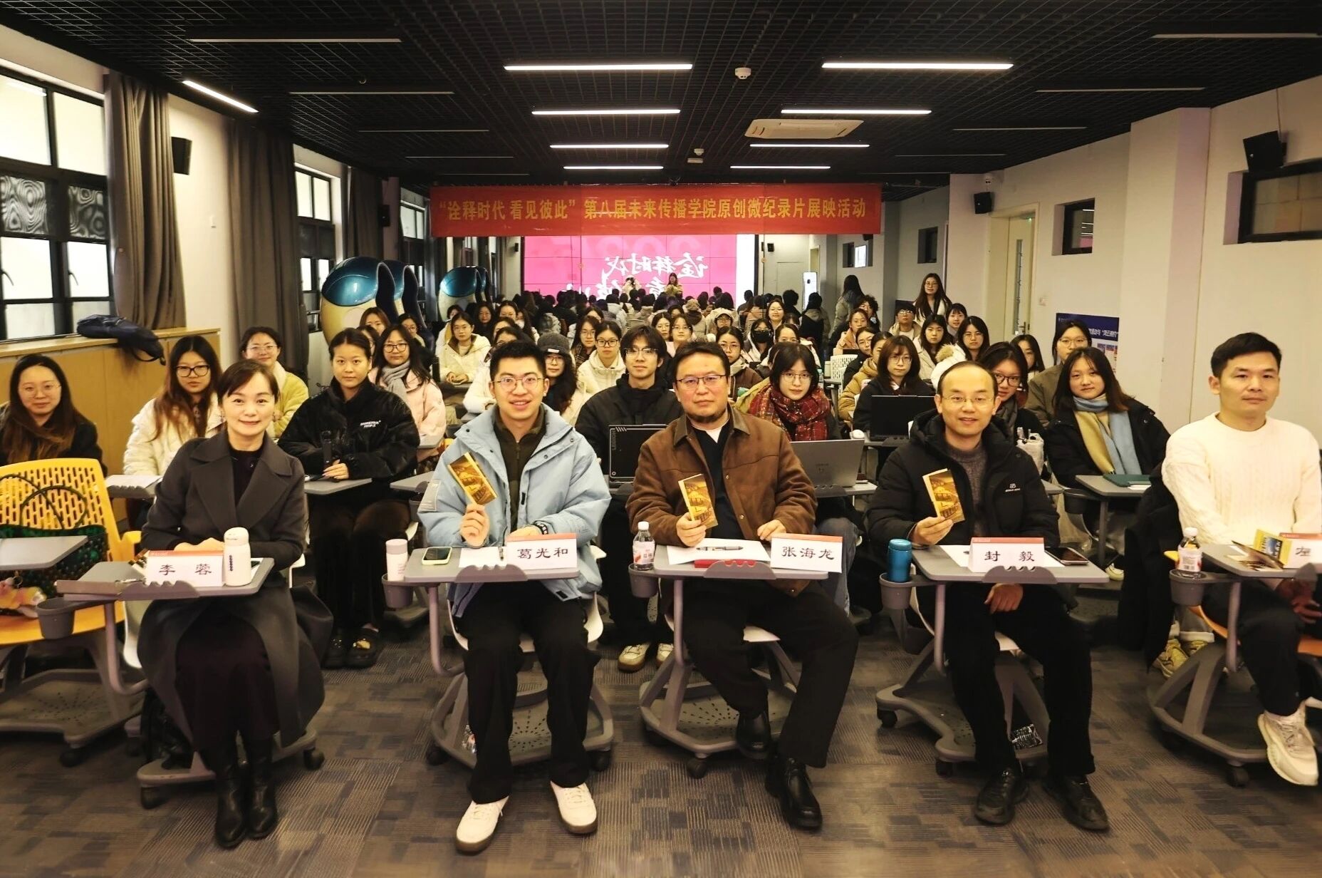 12月30日上午,“诠释时代 看见彼此”第八届未来传播学院原创纪录片首映活动(新闻、广告班专场)顺利举办。本次活动邀请了新假日传媒总策划,中国广播电视艺术资料研究中心特聘研究员张海龙、浙江工商大学未来传播学院党委书记、副院长李蓉、浙江工商大学管理工程学院副教授封毅、浙江工商大学未来传播学院新闻系教师左蒙、团委艺术教育中心教师葛光和担任评委嘉宾。