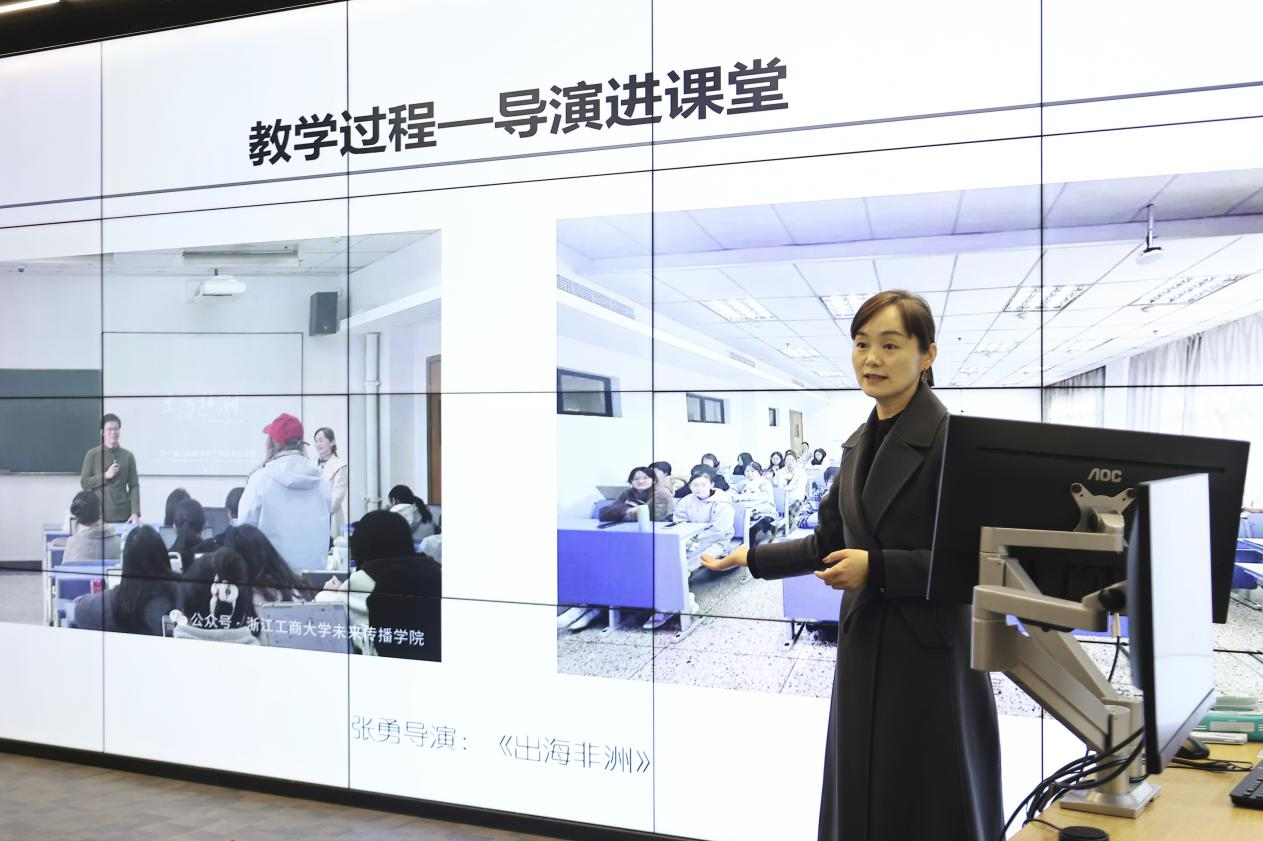 浙江工商大学未来传播学院党委书记、副院长李蓉老师担任本学期《纪录片专题研究》课程的主讲人之一。该门课程已获评国家级一流课程,但李蓉老师仍在实践中不断改革调整授课方式。她以“四力融通,五环联动”为思路进行全链路的教学设计。线下,通过翻转课堂、组织纪录片点映活动、实务精英进课堂等活动促进同学们开拓思路;线下,通过慕课平台、AI助教答疑查漏补缺。