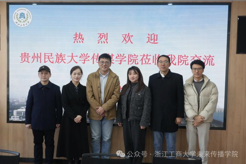 1月13日上午,未来传播学院与贵州民族大学传媒学院在下沙校区综合楼404会议室,围绕产教融合与人才培养、社会服务与校媒合作两大核心主题,针对学院建设发展开展深度交流。贵州民族大学传媒学院网络与新媒体系副教授符柯、新闻系讲师李娟,与院党委书记兼副院长李蓉、广告系教师兼院教发展中心主任门书均、网络与新媒体系教师殷克涛、新闻系教师李至颖参会。