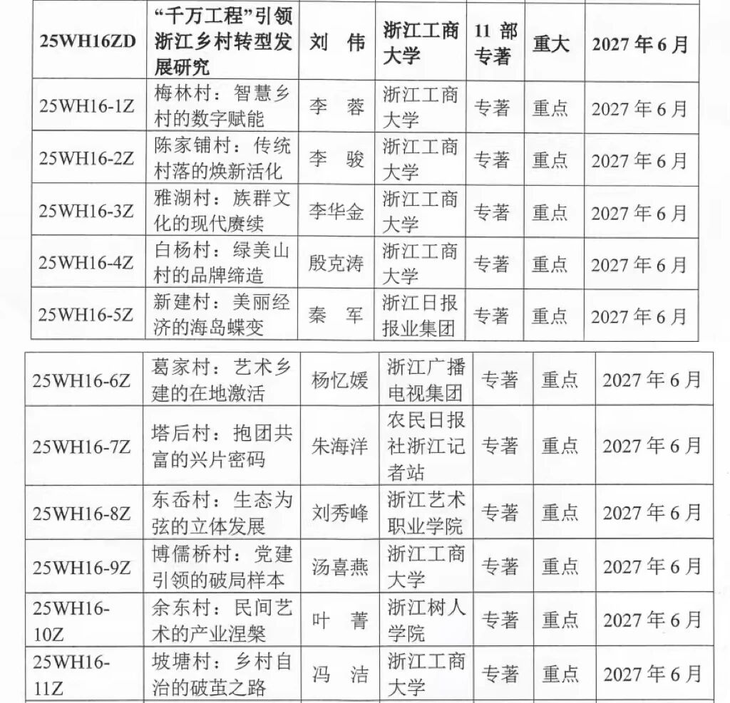 根据《浙江文化研究工程项目管理办法》,经专家评审,浙江省哲学社会科学工作办公室审批,近日,2025年浙江文化研究工程第二批立项项目名单正式公布。由未来传播学院教师团队牵头申报的“‘千万工程’引领浙江乡村转型发展研究”获得立项。该项目共有11项子课题,由我院联合浙江日报报业集团、浙江广播电视集团、农民日报社浙江记者站、浙江艺术职业学院、浙江树人学院等单位共同实施。课题组将加强与媒体单位合作,着力构建“学术研究+媒体实践”协同创新模式,研究中注重实践性、理论性与传播力的融通,为新时代浙江文化建设与发展注入新动能。