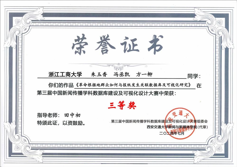 理论学习上,本专业注重采写评论的规范与伦理,兼具传统媒体与新媒体特色,以赛促学,以实践验证理论。中国新闻史课上,我和小组同学的课程作业获得了中国新闻史数据可视化大赛的全国三等奖;新闻采写的能力培养让我在2024年度实践中获得“校十佳文字记者”;我的新闻评论学习,使自己有幸向《浙江宣传》公众号供稿。