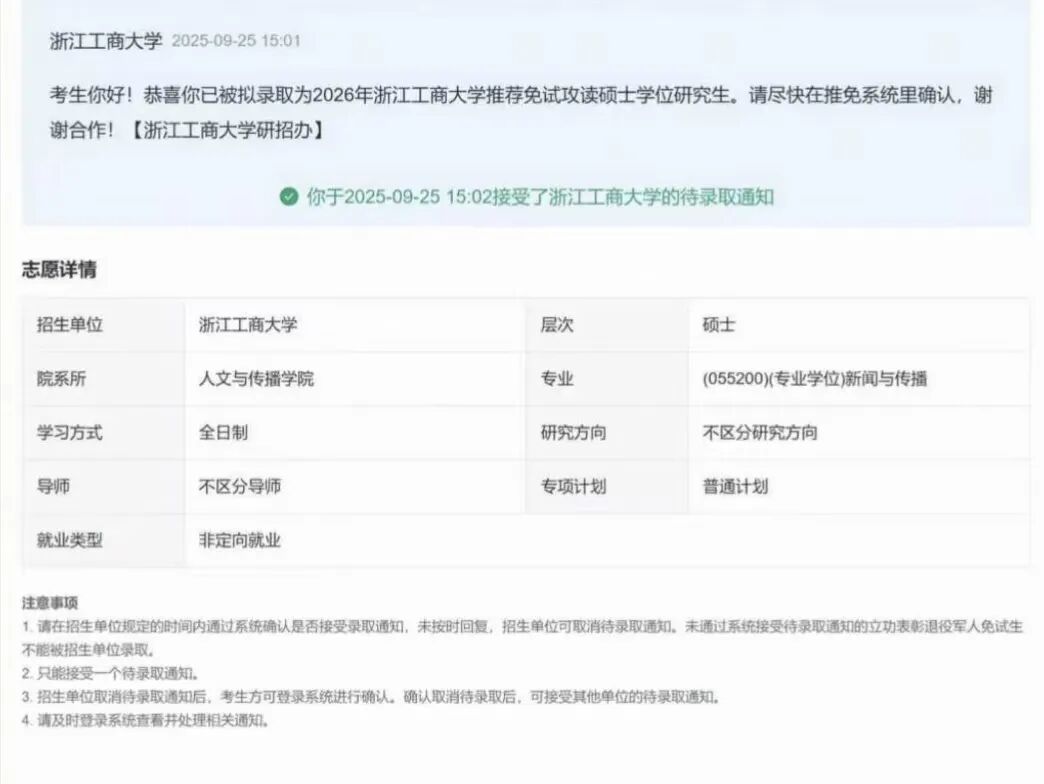 在保研院校的选择上,王艺霏也展现了难得的清醒与务实。在分析自身条件后——专业绩点不算顶尖、获奖等级多为省级、院校背景非双一流,因此,她将主要目标定在本校。“杭州的新媒体资源丰富,本校的平台我也更加熟悉。”她没有盲目追逐名校光环,而是选择最适合自己的道路。即使收到了外校的面试通知,她也基于实际准备情况做出了理性取舍。对她来说,面对需要笔试的学校,与其仓促准备,徒增焦虑,不如集中精力把握合适的机遇。这份有所为有所不为的智慧,让她的保研之路走得格外沉稳。