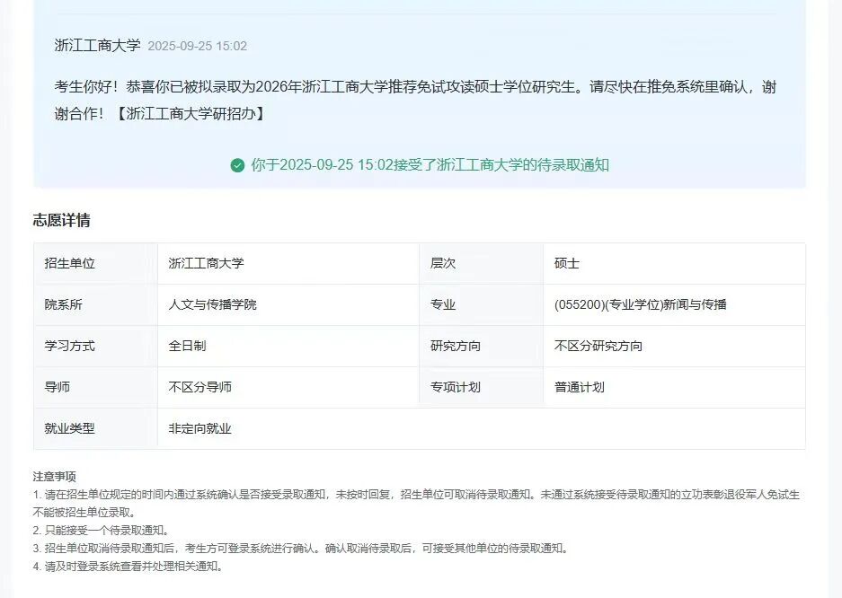 自励,是她在迷茫中锚定方向的精神内核。面对难以拉开差距的学业状况,面对竞赛取得的有限成果,面对自己处于保研边缘的徘徊境地……即便身处迷茫与不确定之中,牛浩楠从未因暂时的差距而自怨自艾,也没有放弃自我精进的脚步。她始终秉持提升自我的初心,在保研与就业的双重规划中,一边深耕专业、稳步提升绩点,一边在学生工作与竞赛中持续积累沉淀,用点滴努力为未来预留更多可能。当推免通知发布,这份长期以来的自我坚守终于有了回响。在对照文件梳理加分项的审慎思考与朋友的暖心鼓励下,牛浩楠决定打破“自我设限”,勇敢尝试,最终用“不抛弃、不放弃”的自励之心,抓住了那翩然而至的机遇,为保研之路点亮微光。