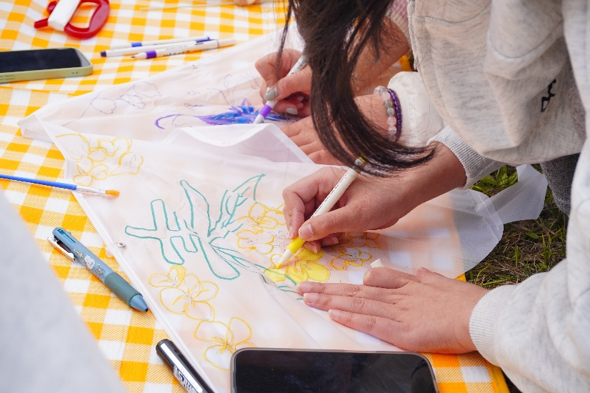 下午两点四十分,所有参赛小组手持完成或尚未完成的风筝,齐聚花海草坪,在镜头前留下了合照。大合照结束后,现场气氛愈发热烈——已经完成绘画的小组迫不及待地开始放飞风筝,尚未完成的小组则回到原地继续创作。