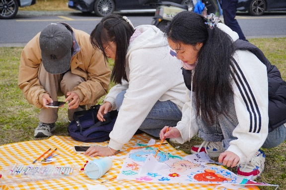 下午一点半,参赛同学陆续抵达活动现场。各组在工作人员处领取空白风筝、颜料、画笔、记号笔和风筝线等材料后,便开始了第一环节的创作。花海草坪上,黄色的野餐布铺展开来,同学们或席地而坐,或伏身挥笔,将心中所想绘于纸鸢之上。有的小组以春日风光为灵感,绘出花团锦簇之美;有的将诗词名句融入画面,书写青春理想;还有的以传统纸鸢为型,勾勒非遗纹样。也有一部分同学选择前往经济楼教室进行创作。安静的教室里,大家围坐在一起,专注地描摹着色,不时交流灵感与想法,现场氛围欢快而专注。