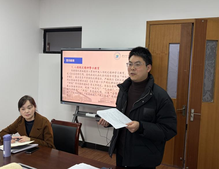 他要求全体党员、教职工推进树立和践行正确政绩观学习教育,大力弘扬“六干”作风,助力学院重点任务落地见效;明确班主任与研究生导师育人职责,加强对考研深造、出国境交流的引导,推动高质量充分就业;落实教职工福利,谋划三八妇女节、春游、疗休养等工会活动。在警示教育中,严格要求全体教职工落实中央八项规定精神,执行公务接待管理办法,规避违规吃喝、违规收送礼品礼金等问题,并结合本领域、身边事开展中央八项规定精神、师德师风、意识形态专项警示教育,要求筑牢纪律底线,严守课堂教学、教材编撰等关键领域的意识形态防线,营造风清气正的政治生态。